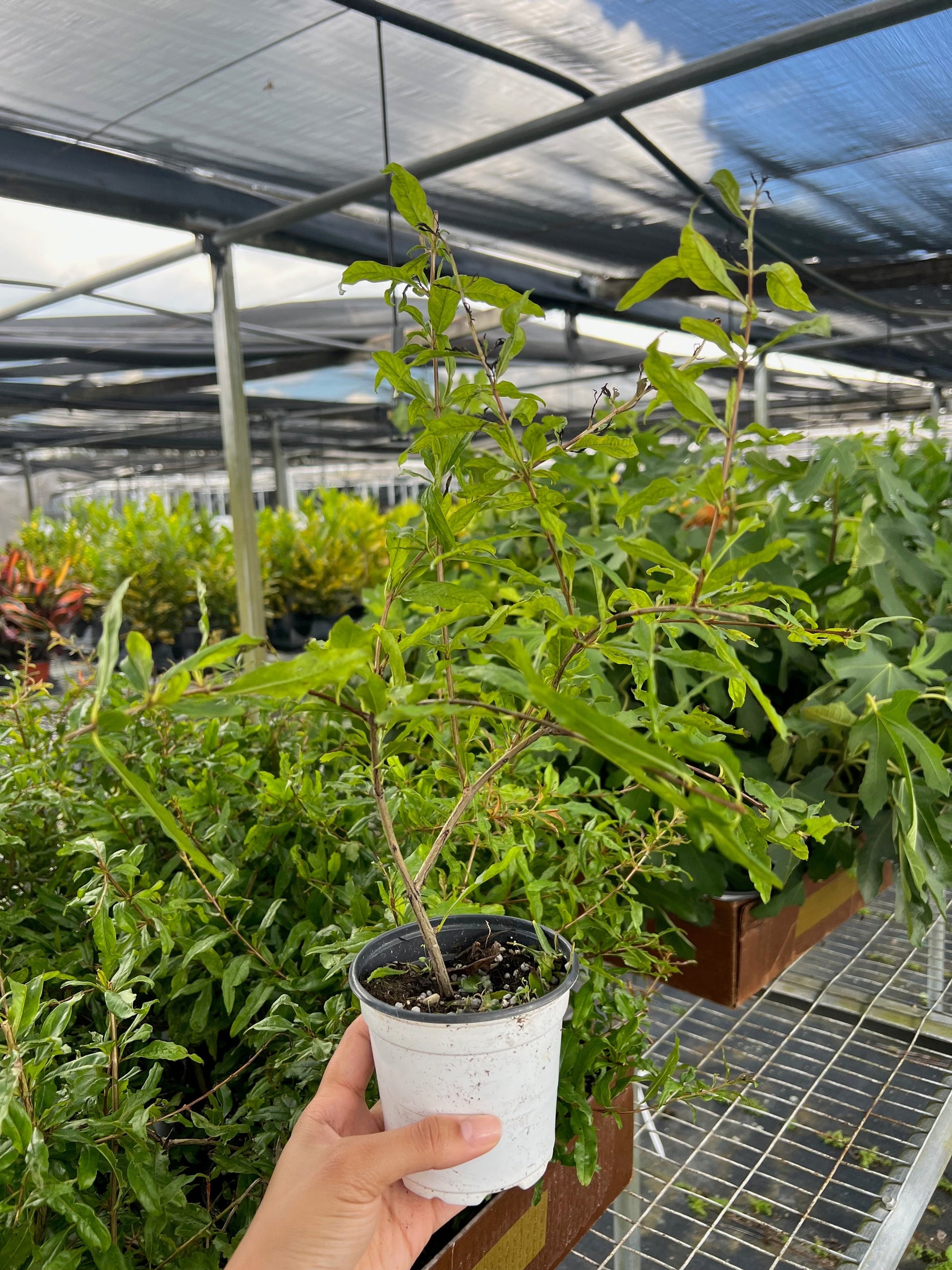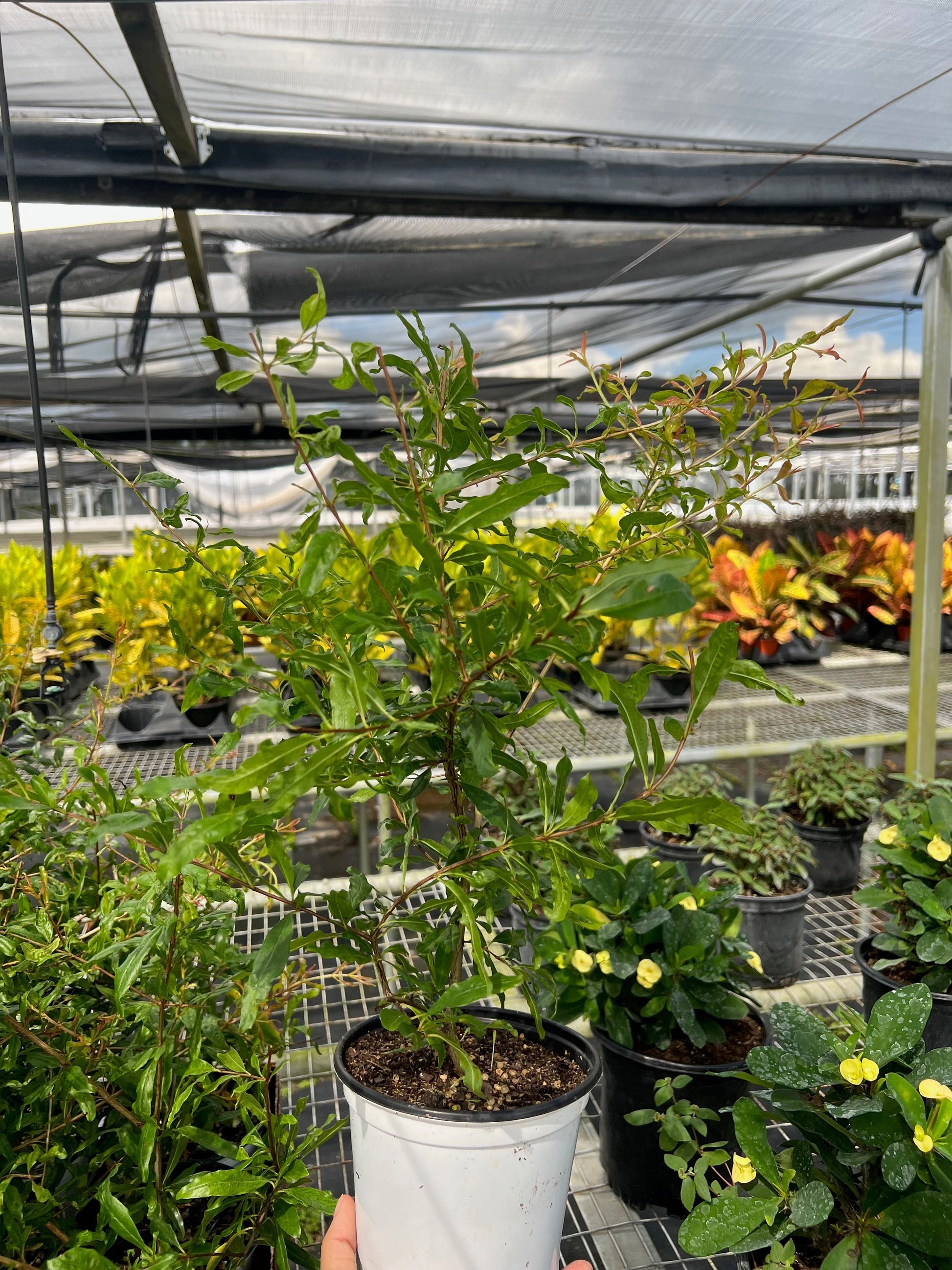 - Description: The pomegranate plant is a large shrub or small tree that has smooth, evergreen leaves and showy orange to red flowers. It has rounded fruit with a dry outer covering (husk) made up of two layers: (1) a hard-outer layer called an epicarp, (2) a soft inner layer called a mesocarp.