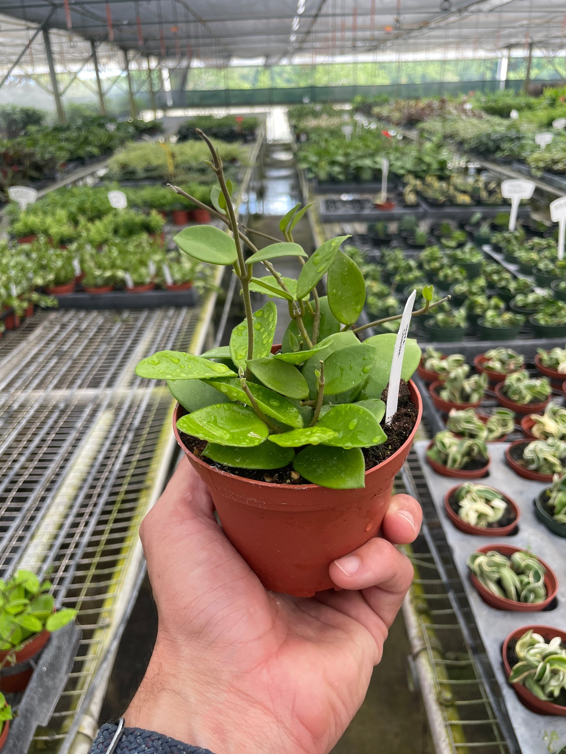 - Description: Hoya bilobata leaves are usually 1.7‚2.2 cm long and 1.3‚1.8 cm wide, with a sub-orbicular or elliptic shape and rounded leaf bases and apexes. The leaves are a dull olive green on top and a lighter green underneath, and can develop dark margins.