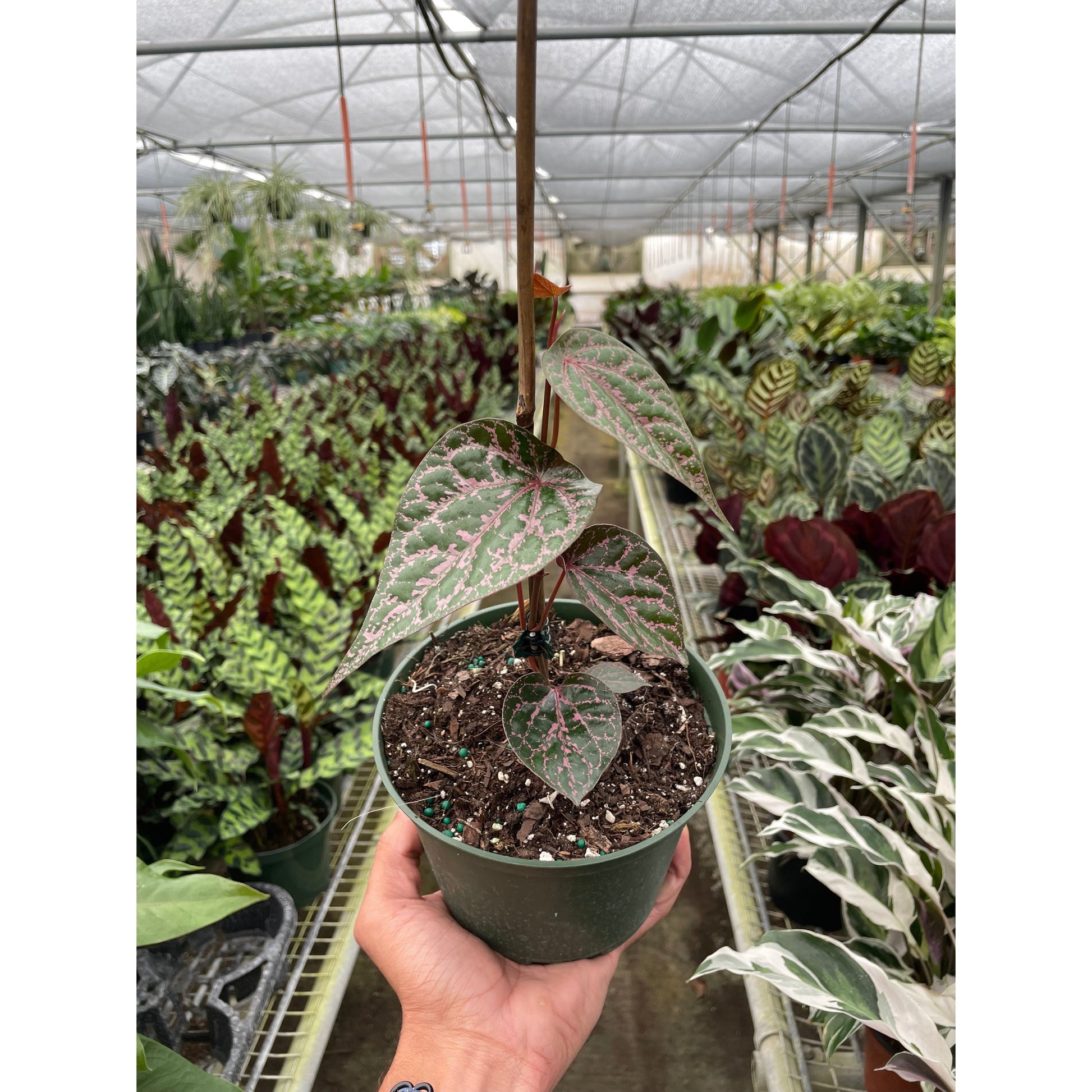 - Description: The Piper Crocatum is a one-of-a-kind plant that is difficult to come by. This plant is native to Peru. These vining plants' thick, glossy leaves dazzle the eye, making them a striking item. The olive green heart-shaped leaf is speckled with pink along with the veining. It's a vining plant that loves to climb on moss poles and stakes.